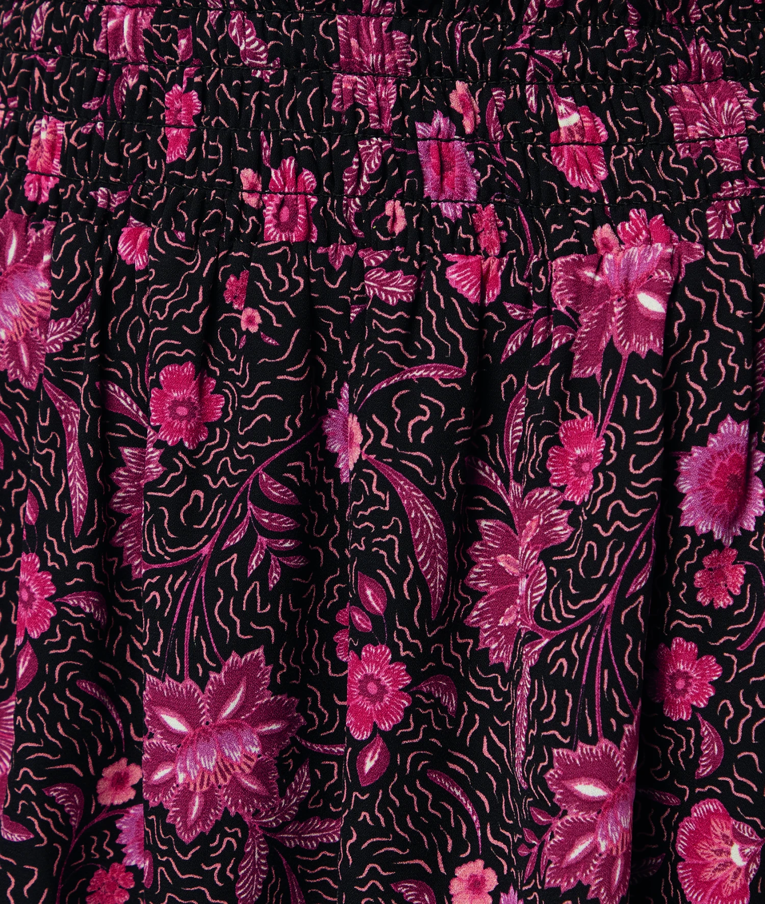 Gesmokter Rock, kurz und ausgestellt – mit betonter Taille und völliger Bewegungsfreiheit dank seiner Leichtigkeit. Mit Stiefeln, einer Hemdbluse und einem kleinen kurzen Mantel für einen formelleren Look.