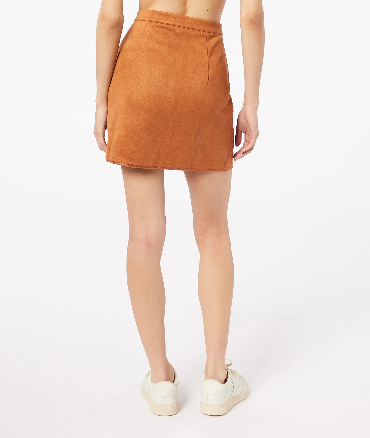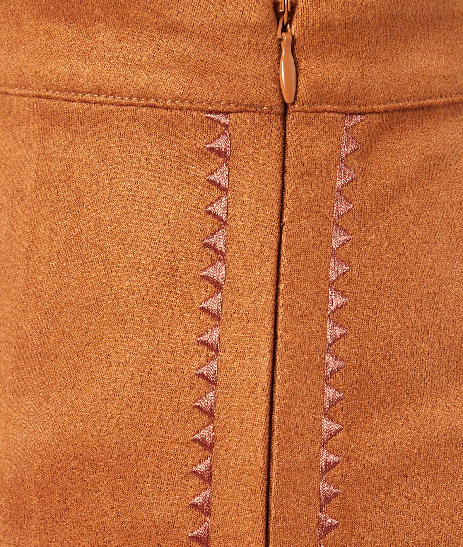 Kurzer Rock in Wildlederoptik mit kontrastfarbenen Motiven an den Säumen. Mit der passenden Jacke zu einem gewagten Total-Look zu kombinieren.