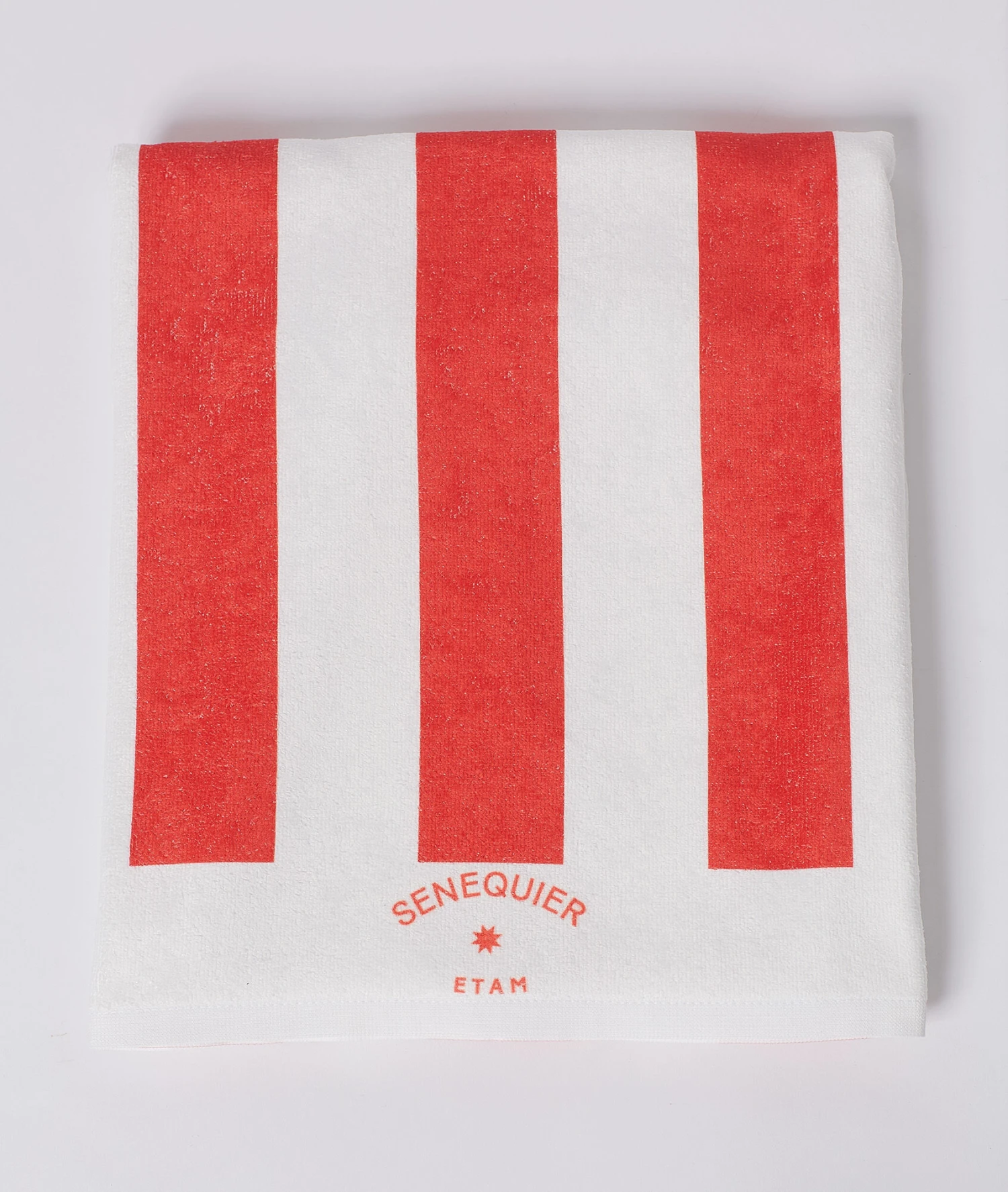 Gestreiftes Handtuch in den Farben des legendären Cafés in Saint-Tropez. Kombinieren Sie es mit dem Badeanzug und den Strandaccessoires für einen einzigartigen und stylischen Total-Look ETAM X SENEQUIER.