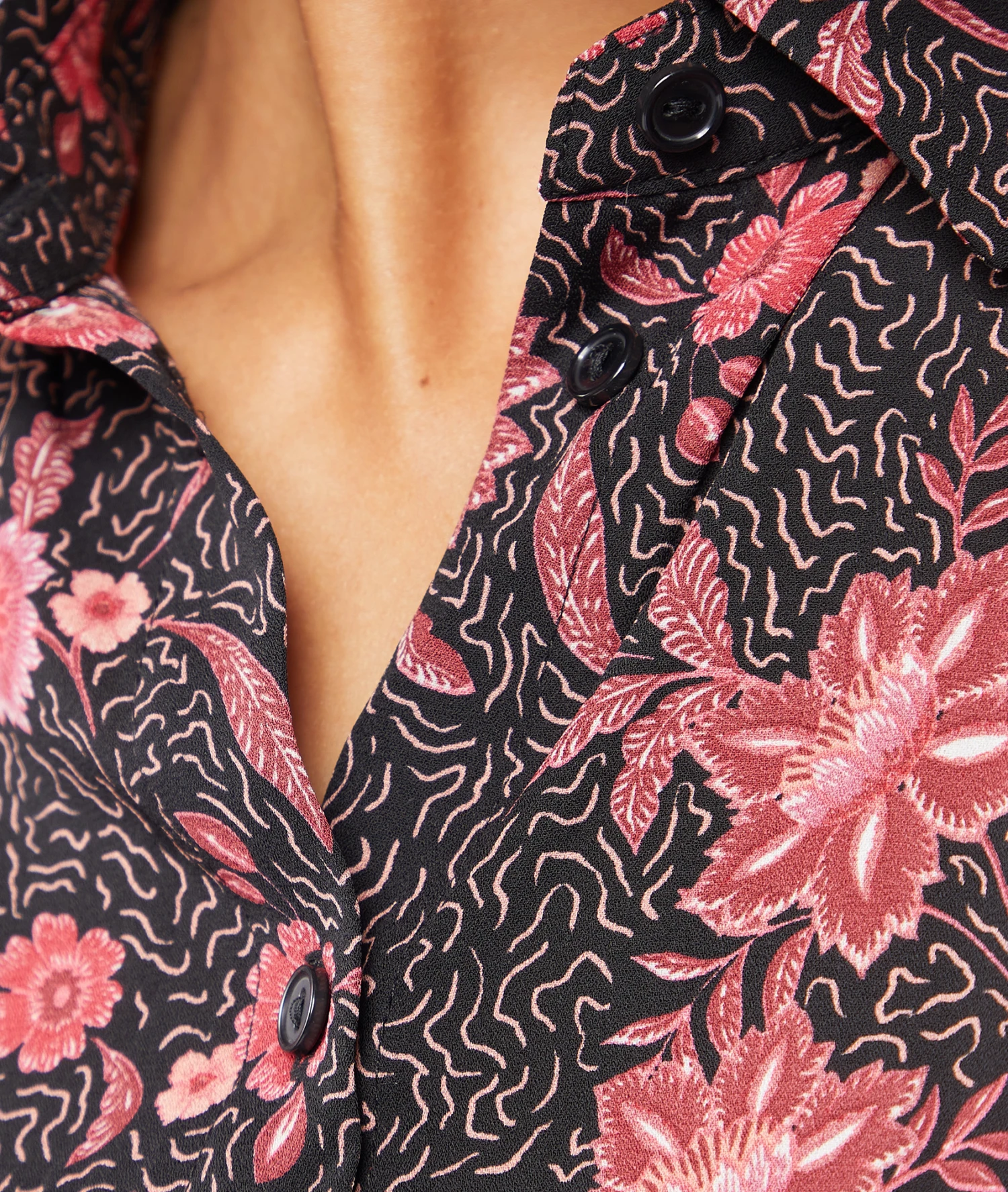Das perfekte kleine Blümchenkleid für jede Gelegenheit! Mit einem geknöpften Hemdkragen, langen Ärmeln und einem seitlich dezent gebundenen Rock.