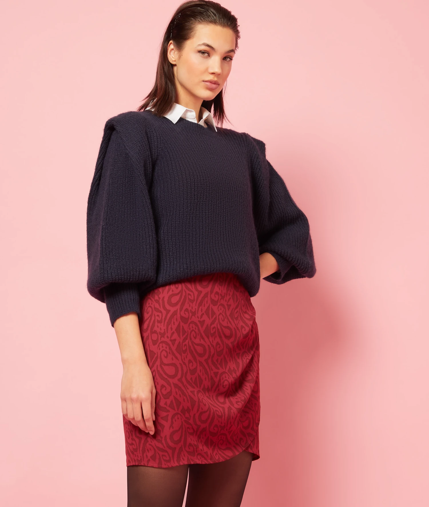 Kurzer und dezent drapierter Wickelrock mit kontrastfarbenem Motiv. Perfekt zu einem Caraco oder einem Teil aus Maxi-Strick.